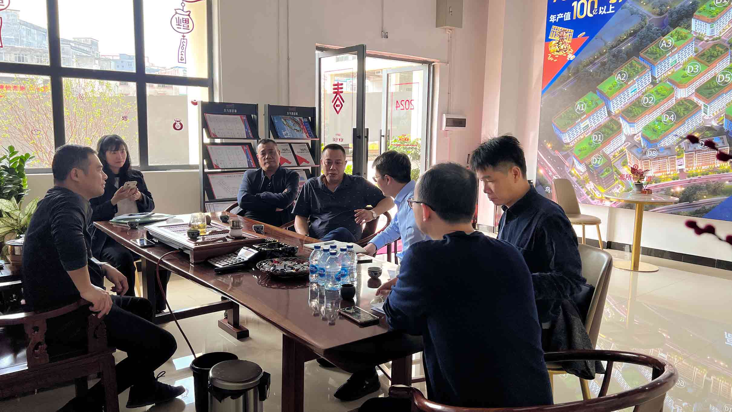 在东马智造城招商中心现场,总经理为考察团详细介绍园区的背景和现况。